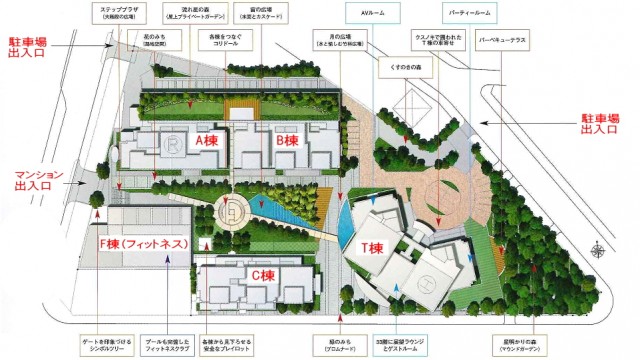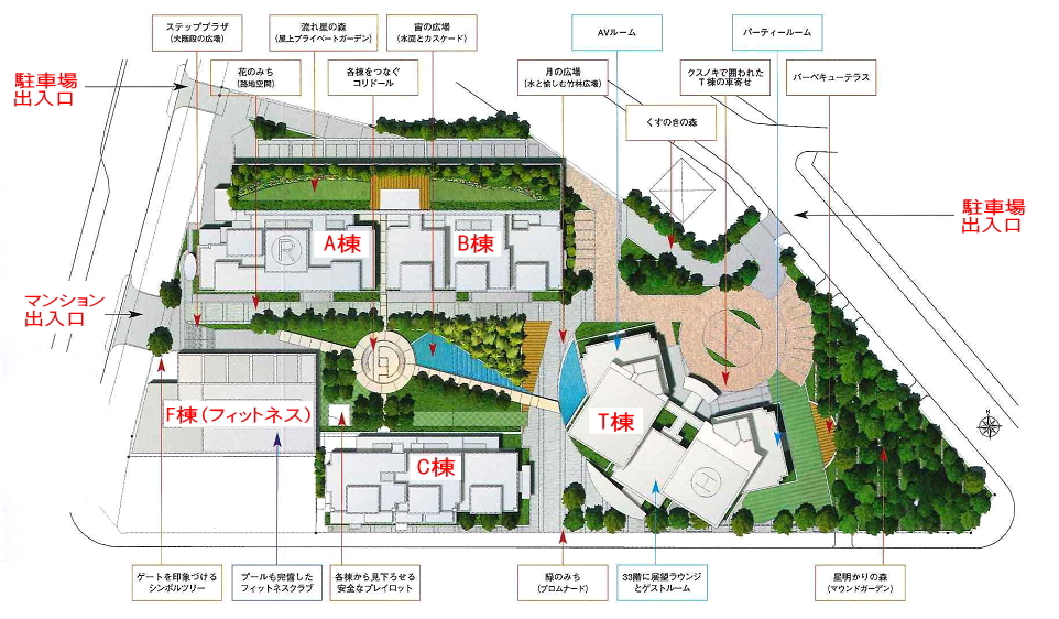 「くずはタワーシティ」は、その敷地内に最高高さ133.8m、地上41階のタワー棟を含め、24階A棟・13階B棟・11階建C棟の4棟と、4階建F棟(フィットネス)がリズミカルに、しかも高い居住性を確保する南面に配棟されています。
